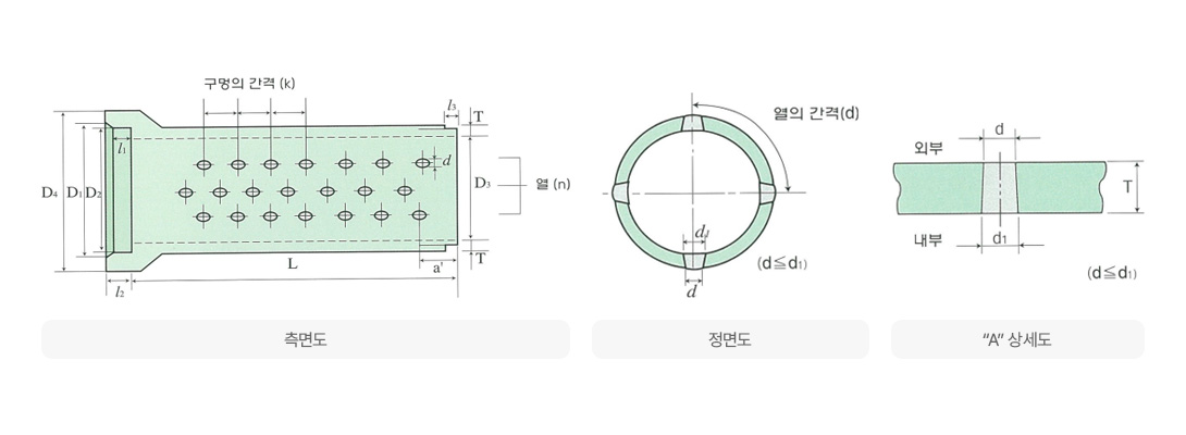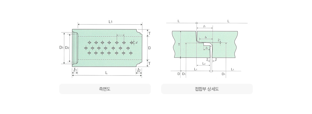 | 안지름 (D) | 두께 (T) | 길이 (L) | 안지름 (Dc) | 두께 (Tc) | 람밍스페이스 (M) | 칼라 길이 (Lc) | 관 | 칼라 | 계 | |